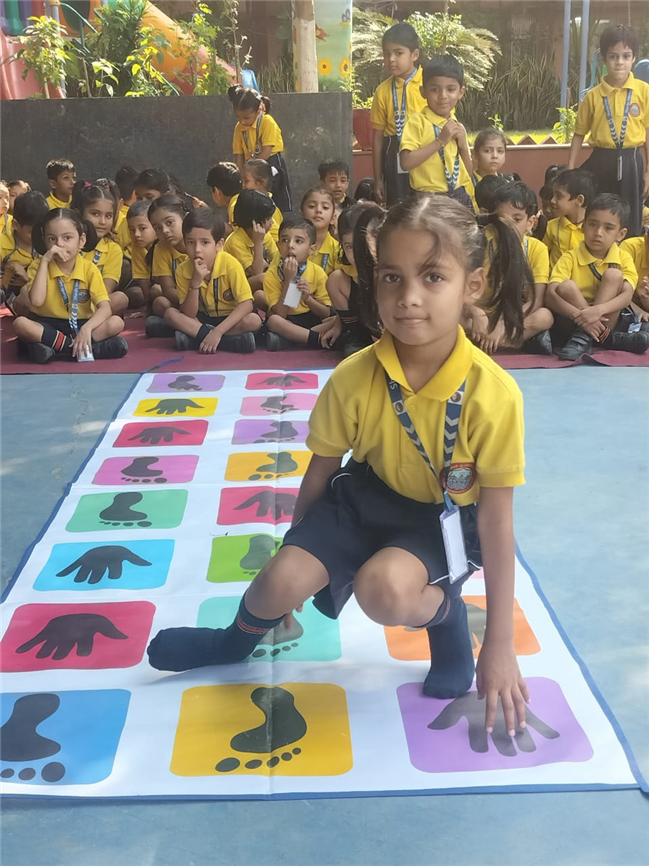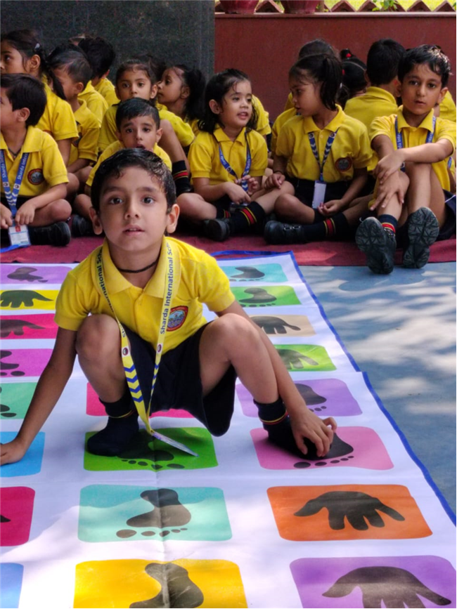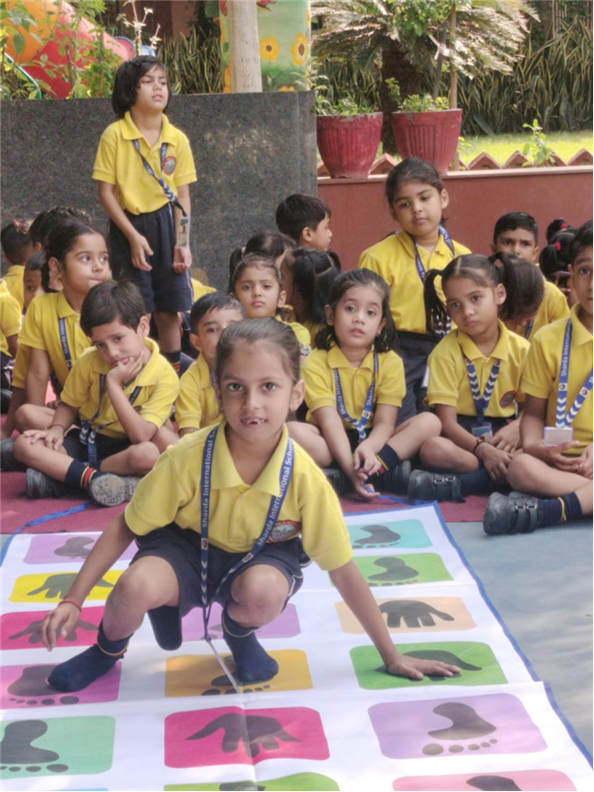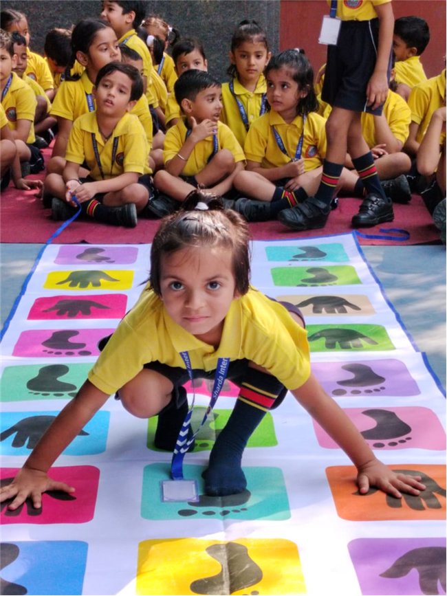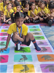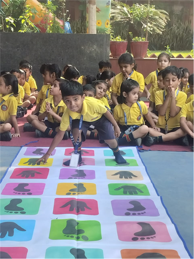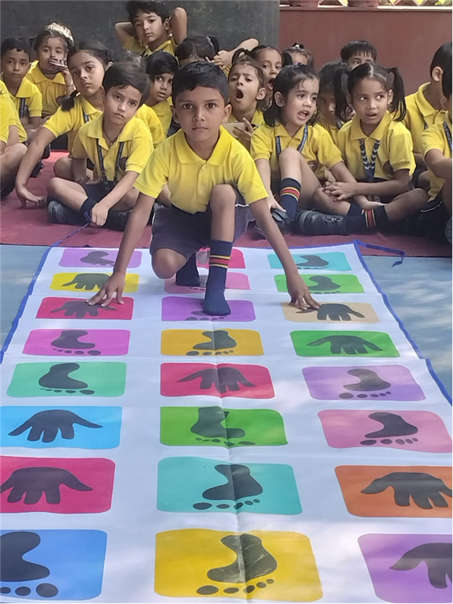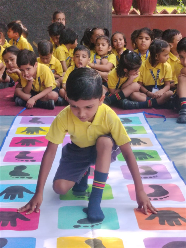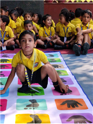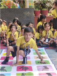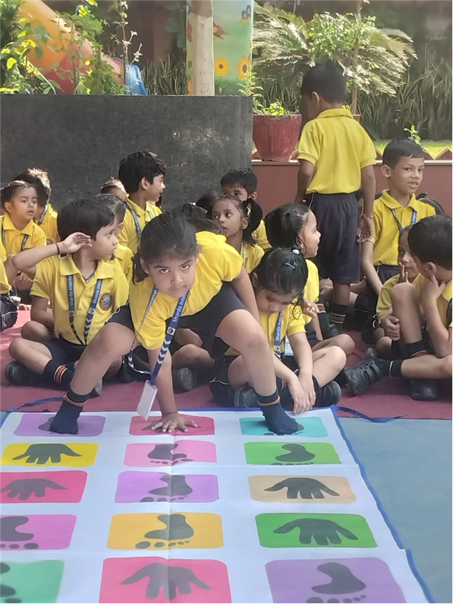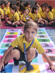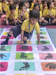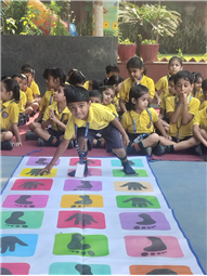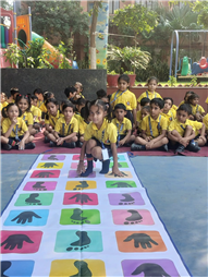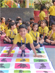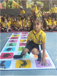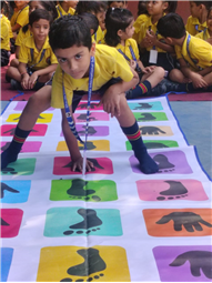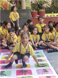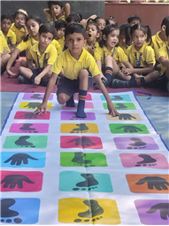 Hopscotch activity was conducted on the jumbo play mat. This activity involves all five domains of a child's development. Students had actively followed the hand and foot prints, hopping and balancing with excitement over the music. The activity had strengthened their hand–eye coordination, gross motor skills, balance, and concentration. They recalled all the instructions given by the teacher and collaborated with the class mates when someone placed over wrong pic. They thoroughly enjoyed the kinesthetic fun-filled learning experience.