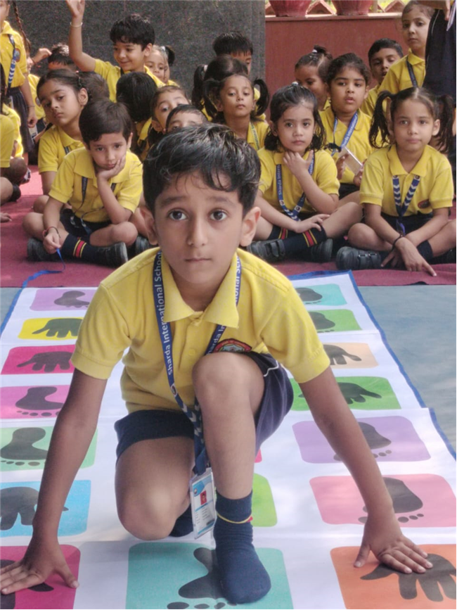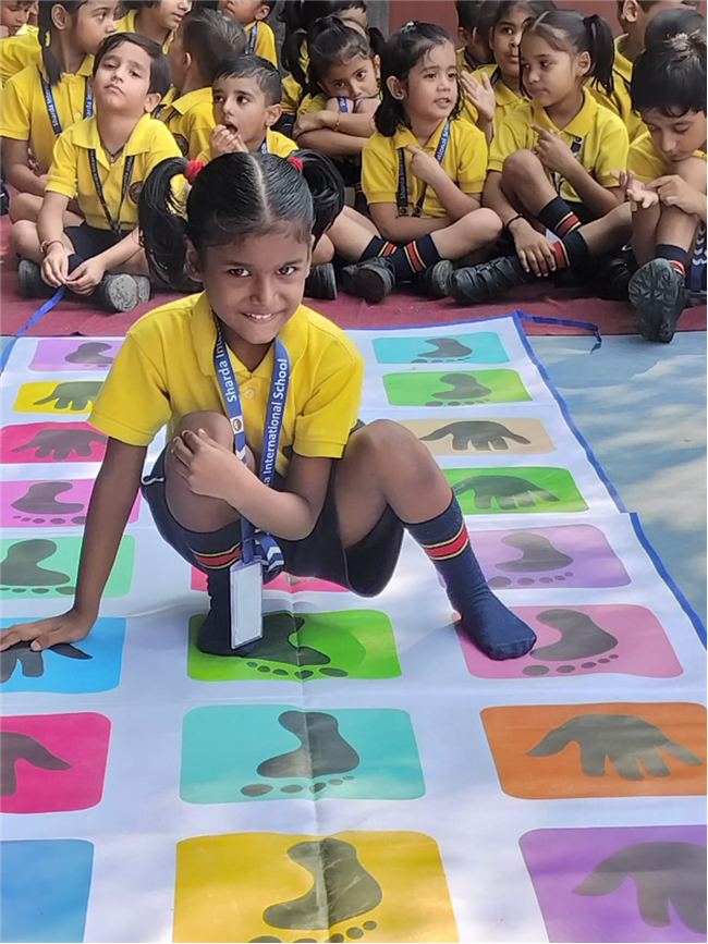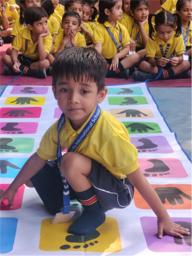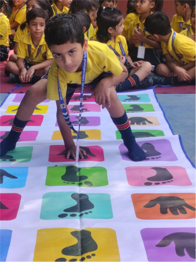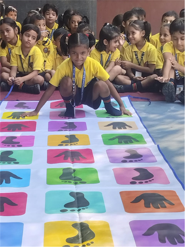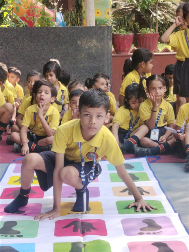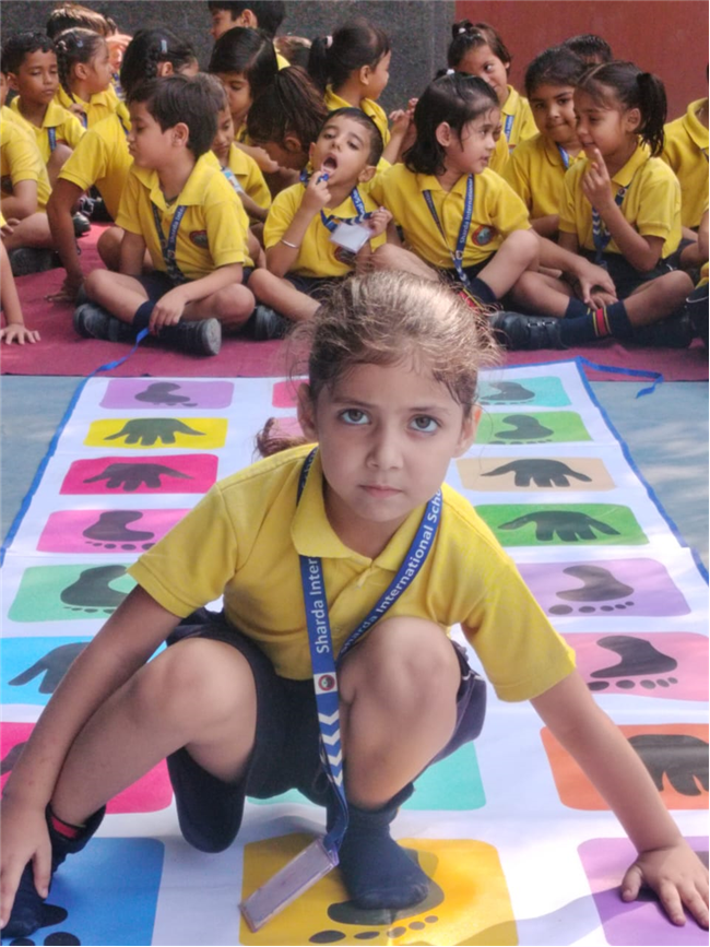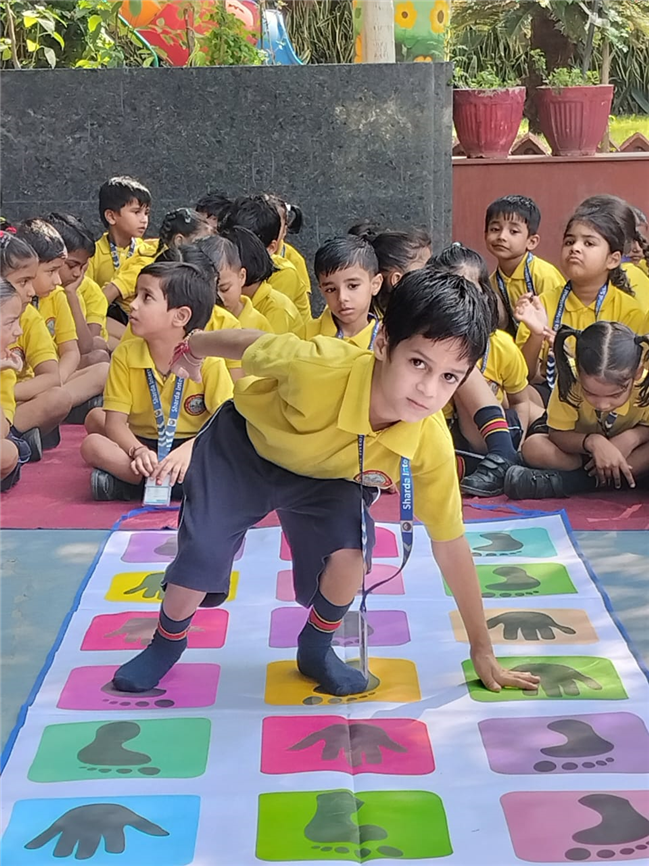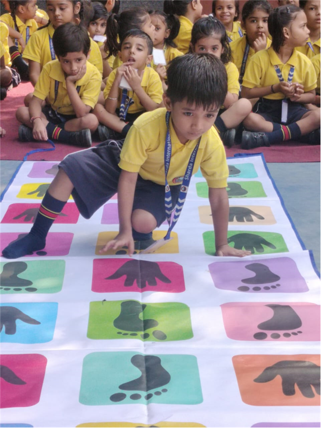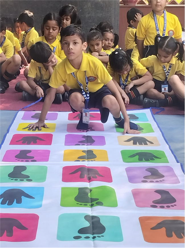 Hopscotch activity was conducted on the jumbo play mat. This activity involves all five domains of a child's development. Students had actively followed the hand and foot prints, hopping and balancing with excitement over the music. The activity had strengthened their hand–eye coordination, gross motor skills, balance, and concentration. They recalled all the instructions given by the teacher and collaborated with the class mates when someone placed over wrong pic. They thoroughly enjoyed the kinesthetic fun-filled learning experience.