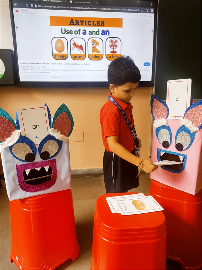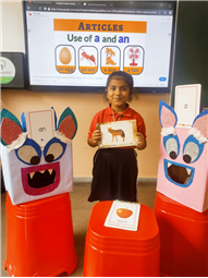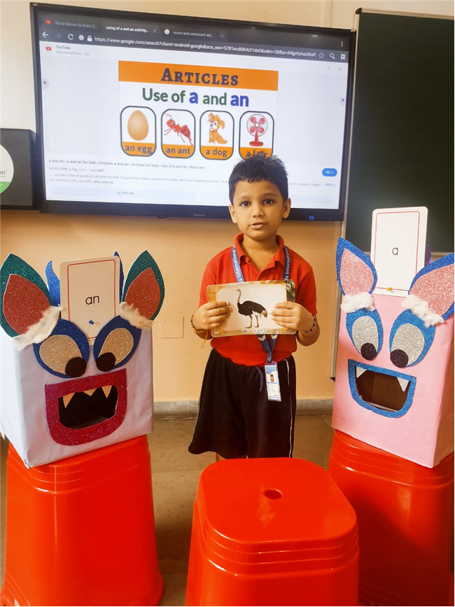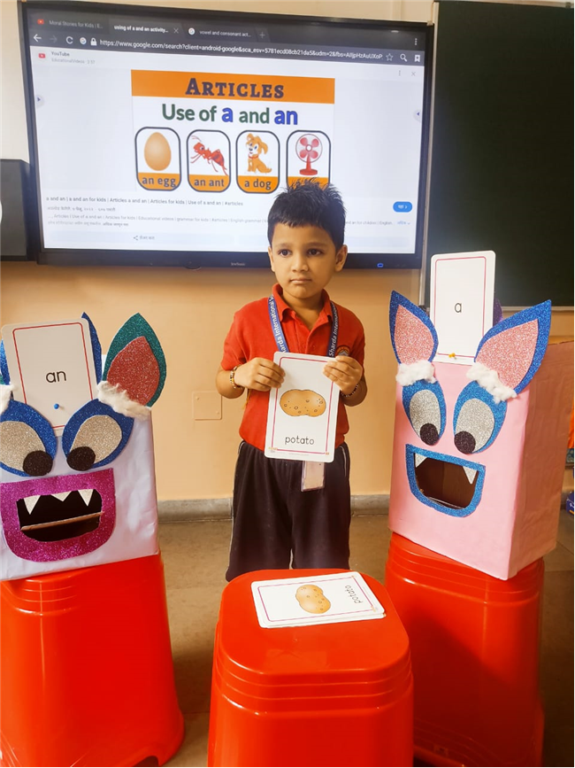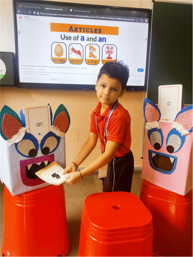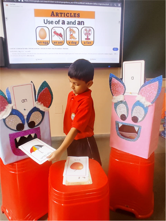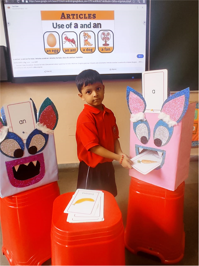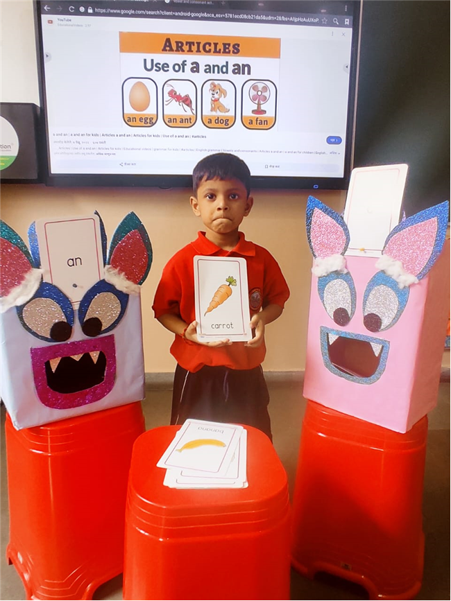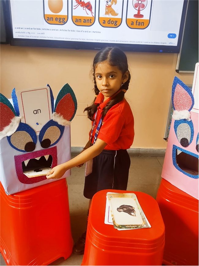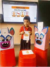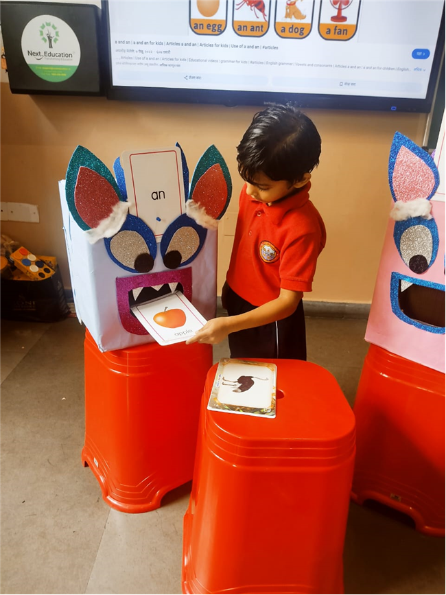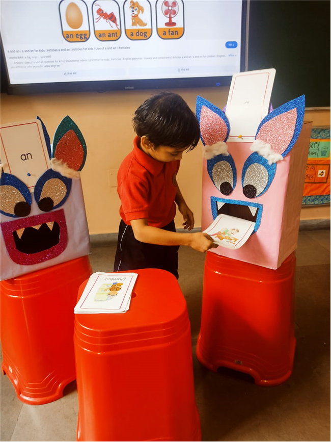 On 18th September, In our kindergarten class, children enjoyed a fun activity on learning the use of “a” and “an” with the help of colorful monster characters. We introduced two friendly monsters – A Monster who eats words that begin with consonants, and An Monster who eats words that begin with vowels. The children picked different picture cards like apple, cat, orange, bat, and igloo, and decided which monster the word should go to.