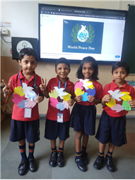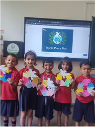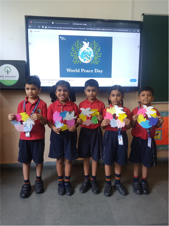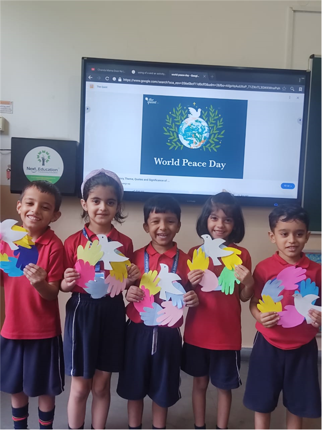 On International Peace Day, children took part in a special handmade activity. They created colorful handprints and doves to show the message of love and harmony. The handprints were pasted around the Earth to symbolize unity among all people. Each child wrote a small peace message on their artwork. The activity helped kids understand the importance of living together in peace and friendship.