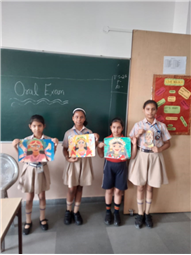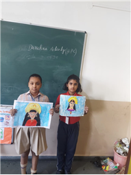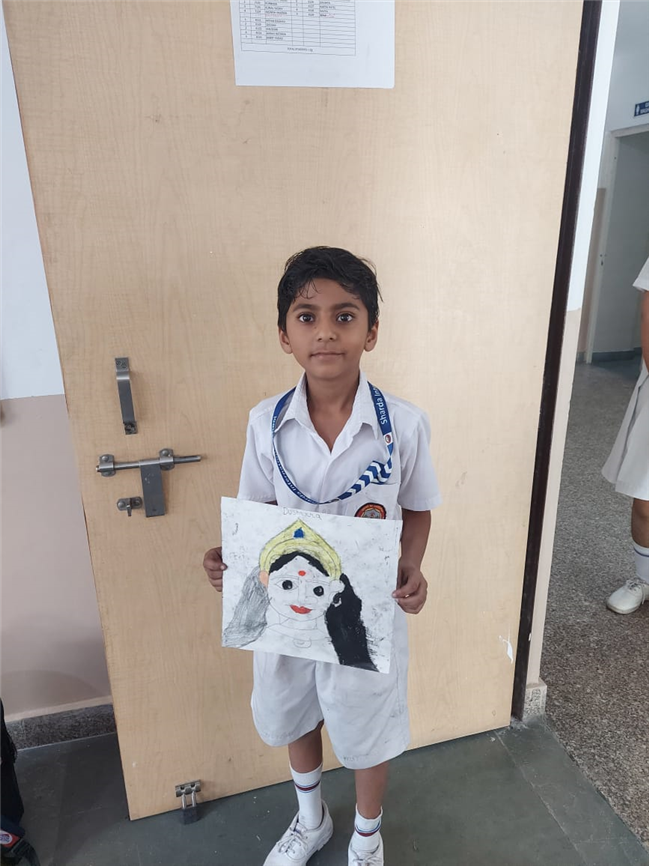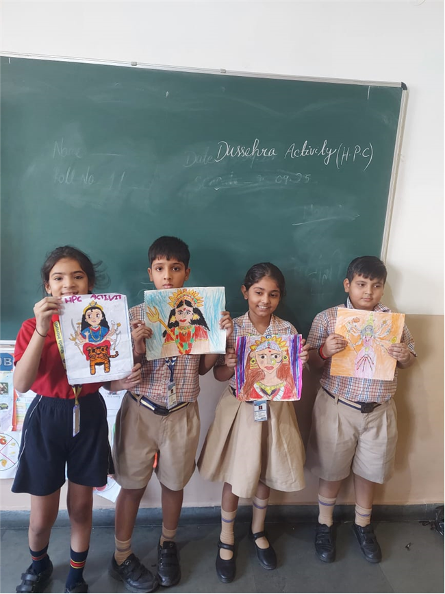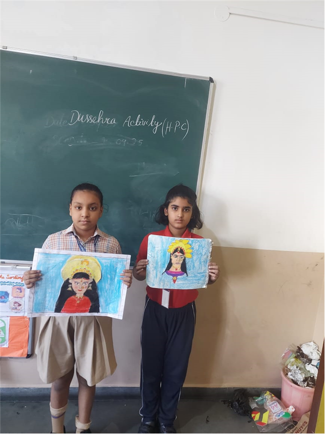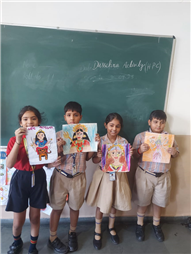 As part of the HPC art activity, students of Class 5 participated in a drawing session where they illustrated Goddess Durga, symbolizing strength and divinity. Each student enthusiastically coloured their drawings and decorated them with beautiful borders using different materials like colours and craft items. The classroom was filled with excitement, creativity, and cultural pride.