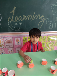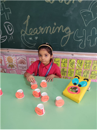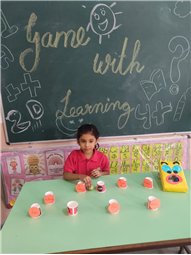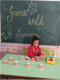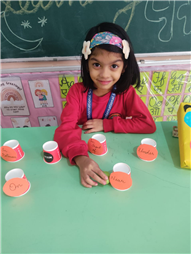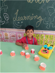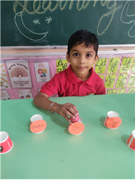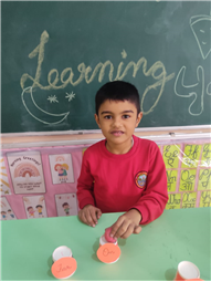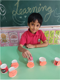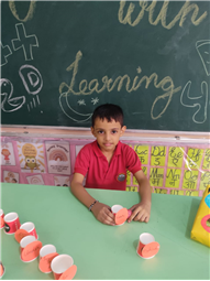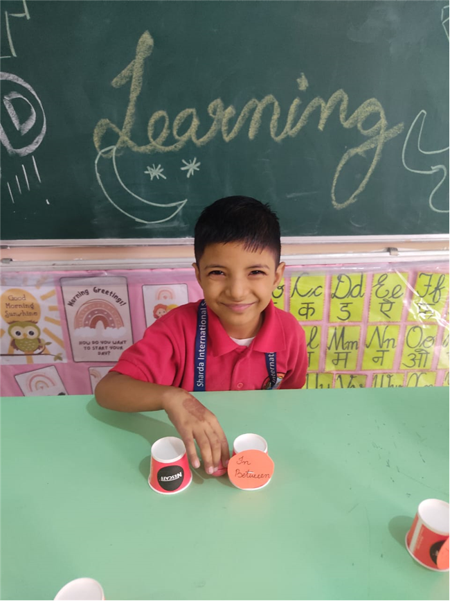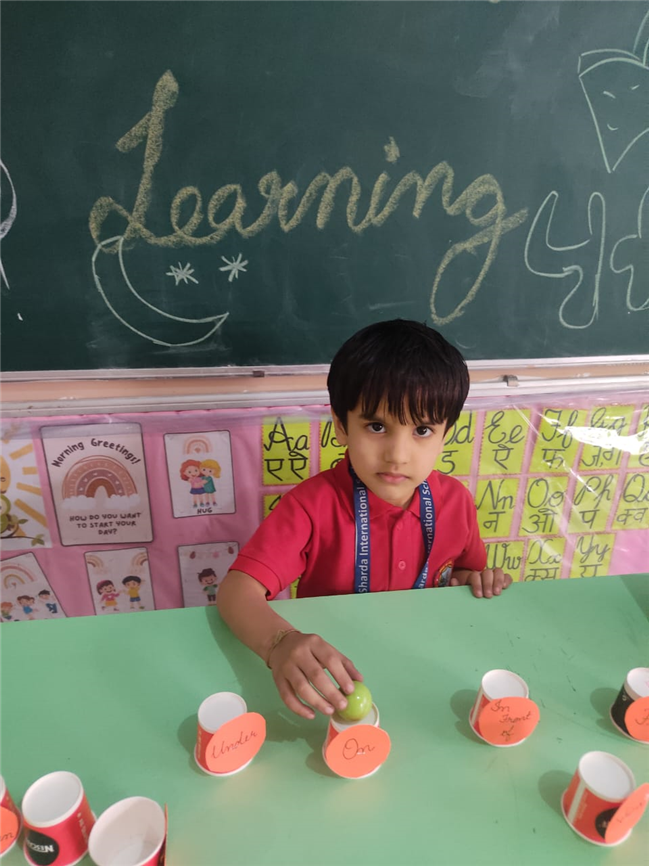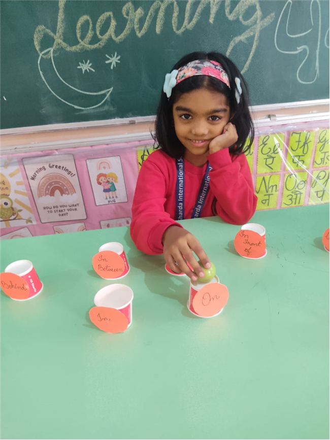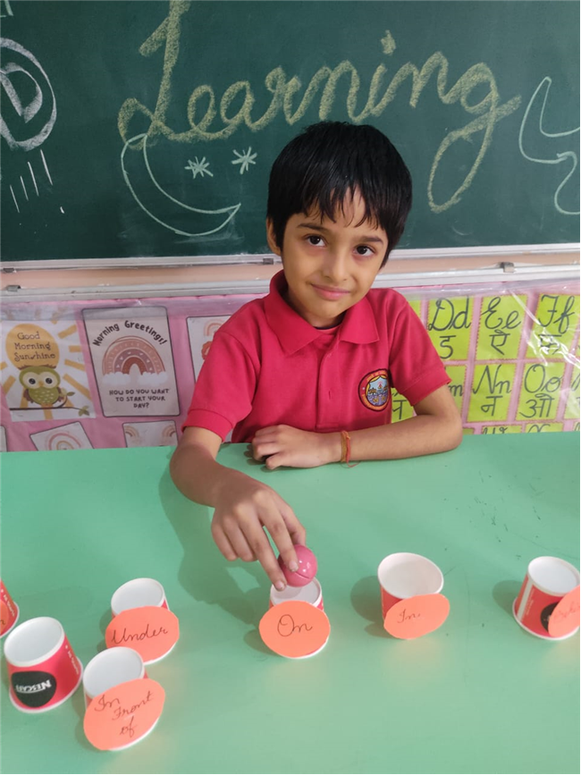 Children used cups and balls to understand the position words through fun, hands-on experiences. They placed the ball in the cup, kept it on the cup, hid it behind the cup, and showed it in front of the cup. They also explored concepts like near and far, and even placed the ball in between two cups.