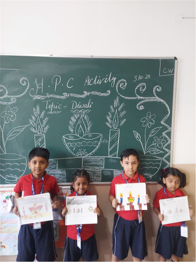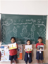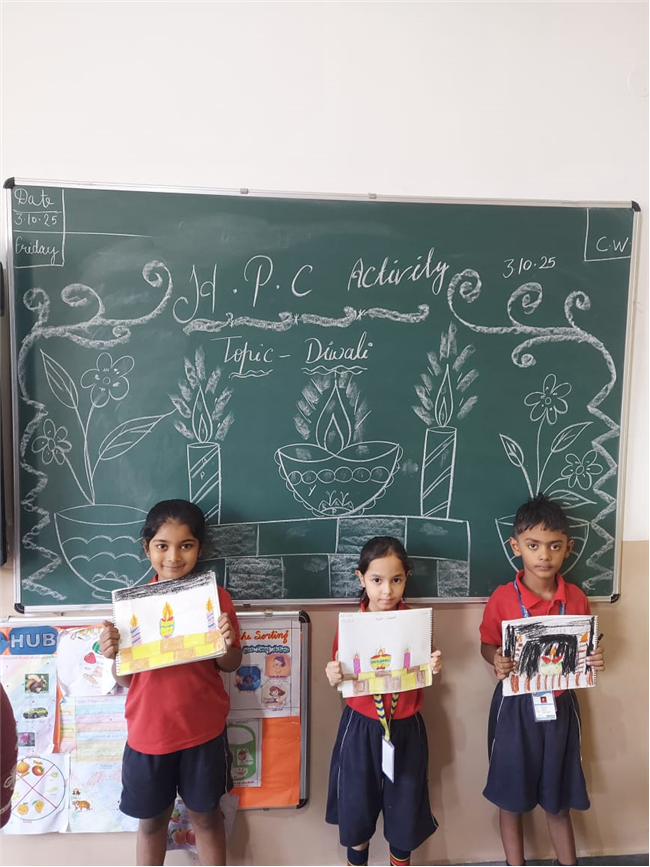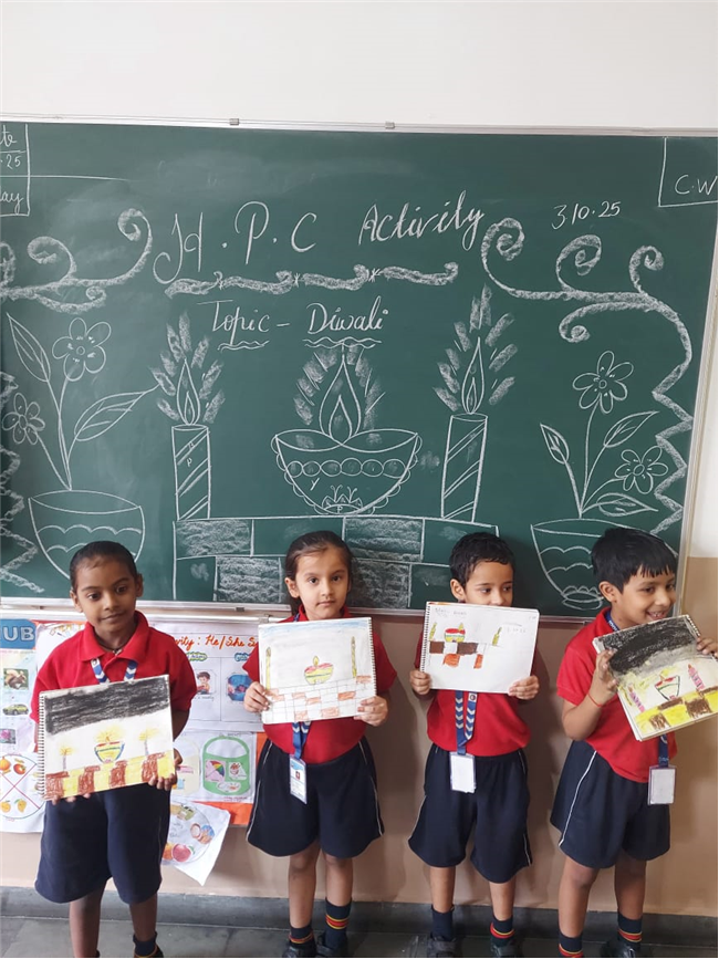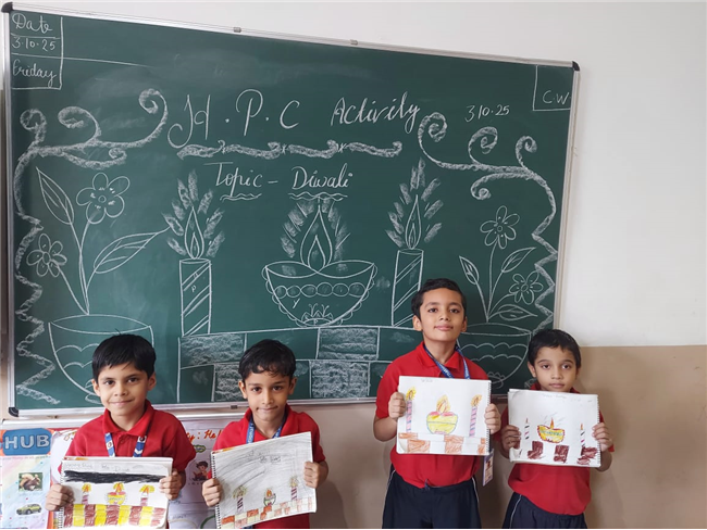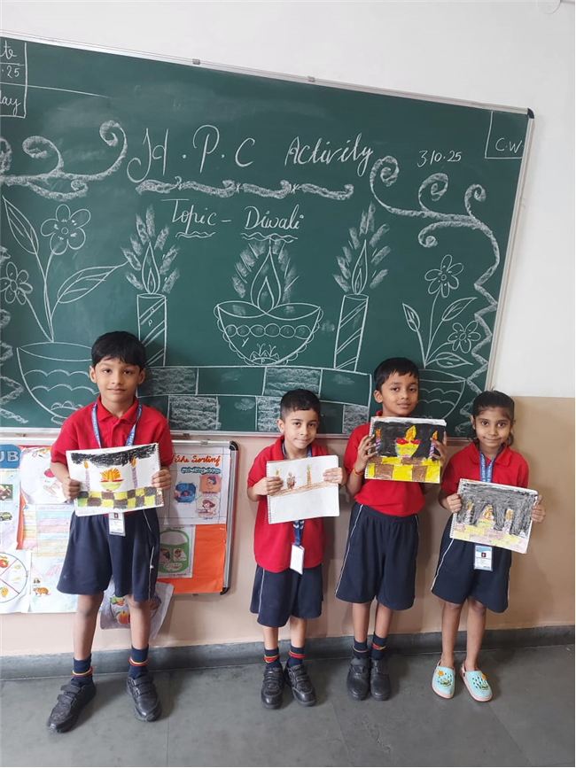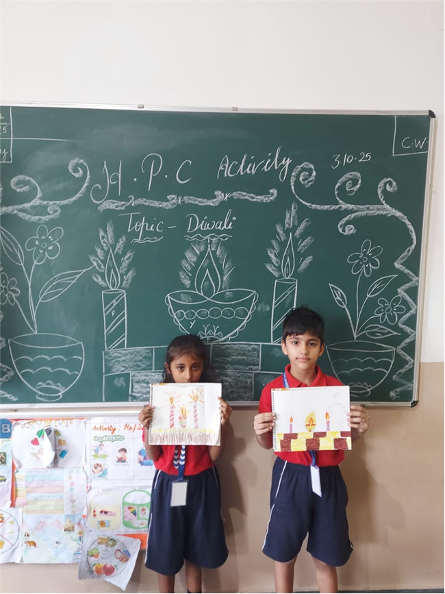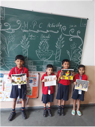 As part of the HPC art activity, students of Class 5 participated in a drawing session where they illustrated Goddess Durga, symbolizing strength and divinity. Each student enthusiastically coloured their drawings and decorated them with beautiful borders using different materials like colours and craft items. The classroom was filled with excitement, creativity, and cultural pride.