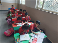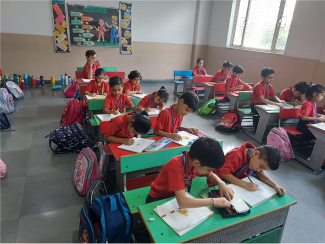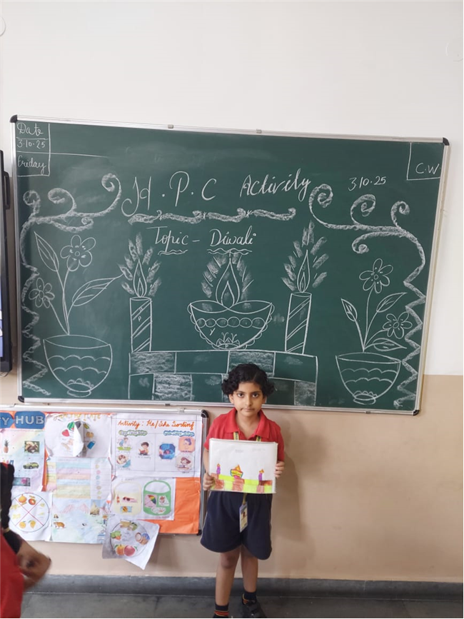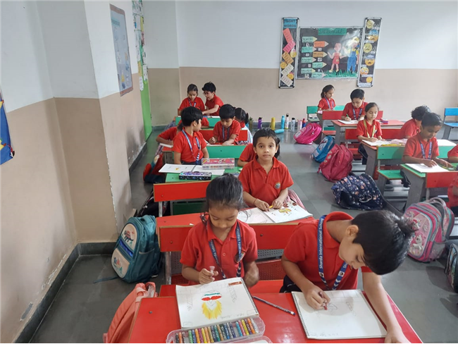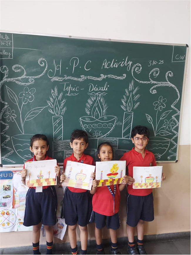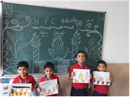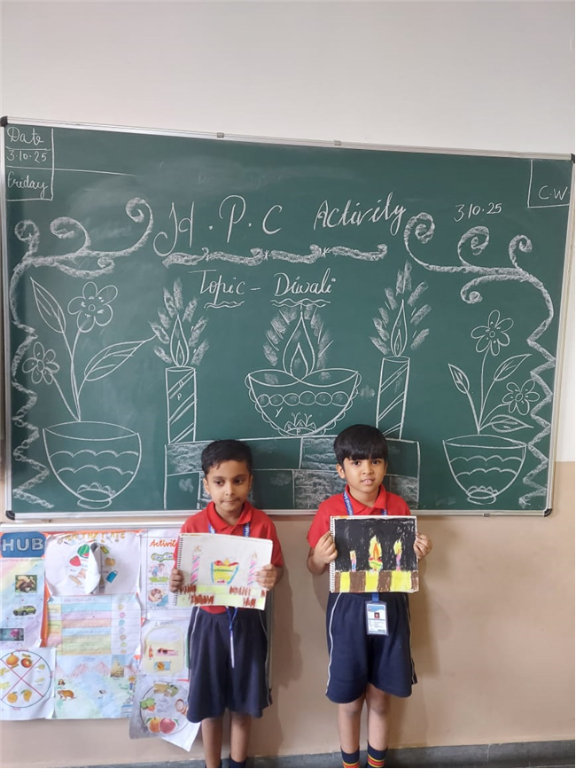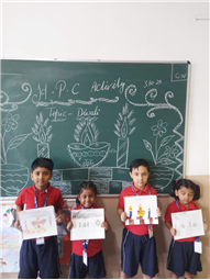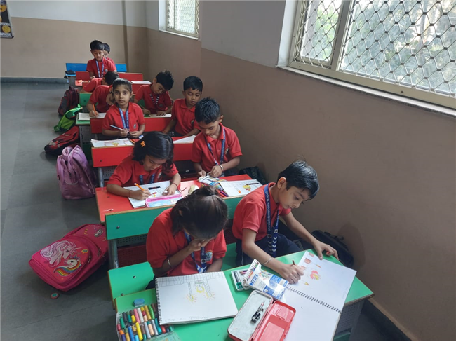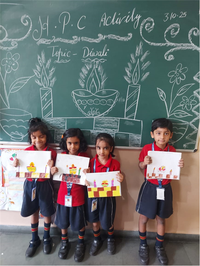 As part of the HPC art activity, students of Class 5 participated in a drawing session where they illustrated Goddess Durga, symbolizing strength and divinity. Each student enthusiastically coloured their drawings and decorated them with beautiful borders using different materials like colours and craft items. The classroom was filled with excitement, creativity, and cultural pride.