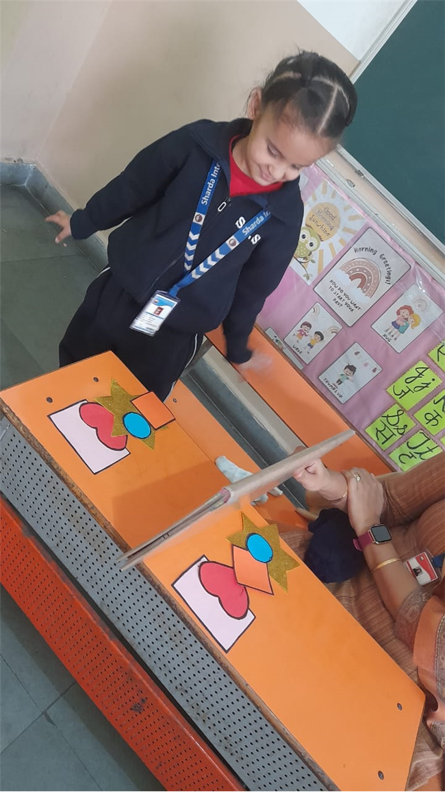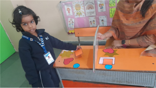 Today, our students participated in a fun and educational Shape Pattern Learning Activity. Five different shapes—heart, square, rectangle, star, and circle—were arranged in a pattern. The children had to come forward, look carefully at the pattern, remember it, and then recreate the same pattern on the other side.